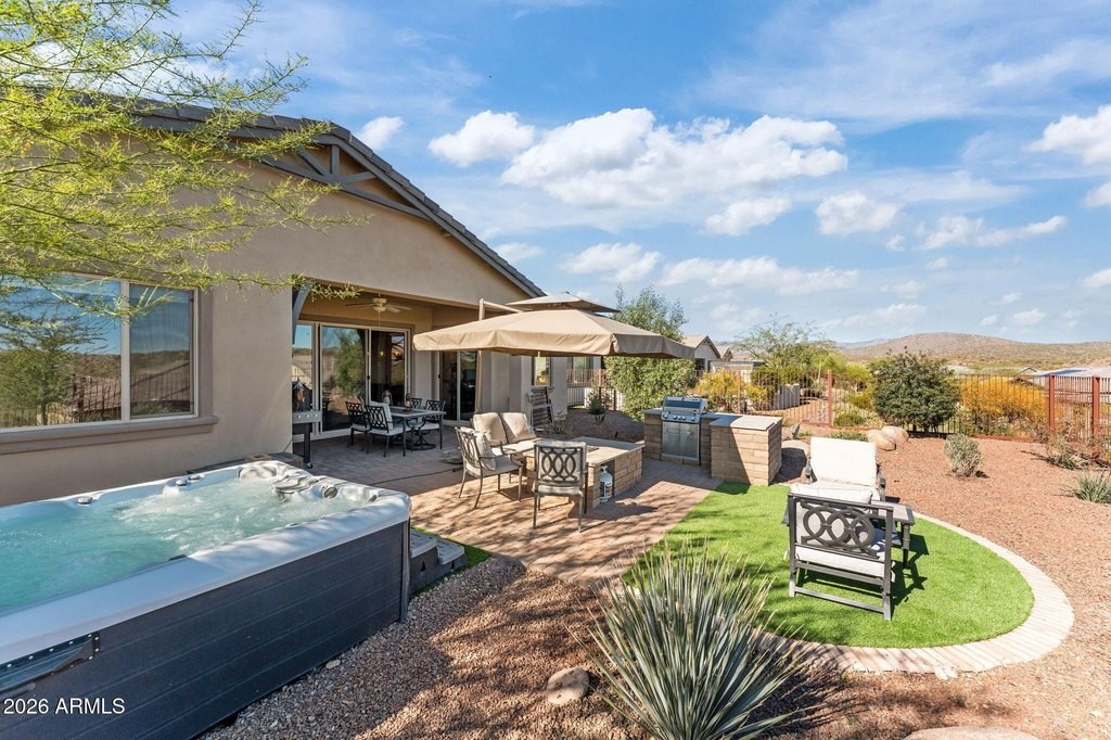 THIS 3B/2bath HOTEL CALIFORNIA WELCOMES YOU HOME IN GRAND STYLE. THE INVITING, LUXURIOUS FOYER is ADORNED W/ A MASTER CRAFTED CUSTOM ROCK ARCH THAT MATCHES THE LIVING ROOM FIREPLACE. 2 FULL WALLs OF GLASS FRAME BEAUTIFUL Mountain Views & SUNRISES. Views FROM THE KITHCHEN, DINING, MASTER & LIVING SPACE. MASTER BEDROOM ENSUITE. 3 CAR GARAGE IS TEMP CONTROLLED. FENCED PERIMETER. HOURS OF SHADE & COMFORT WILL VISIT YOU AS YOU SIT BACK, RELAX & ENJOY THE FESTIVE AMBIANCE THAT THIS BACK PATIO PROVIDES. PAVED & COVERED FOR YOUR AFTERNOON ENJOYMENT. CUSTOM BLOCK GRILL STATION. INTIMATE TURF SETTING AREA. THE GAS FIRE TABLE IS PERFECT TO GATHER AROUND AFTER AN EVENING IN THE JACUZZI. RESORT LIVING AT ITS BEST. LOW MAINTENANCE LANDSCAPING & LIVING ALLOWS YOU TIME TO ENJOY THE BETTER THINGS IN LIFE